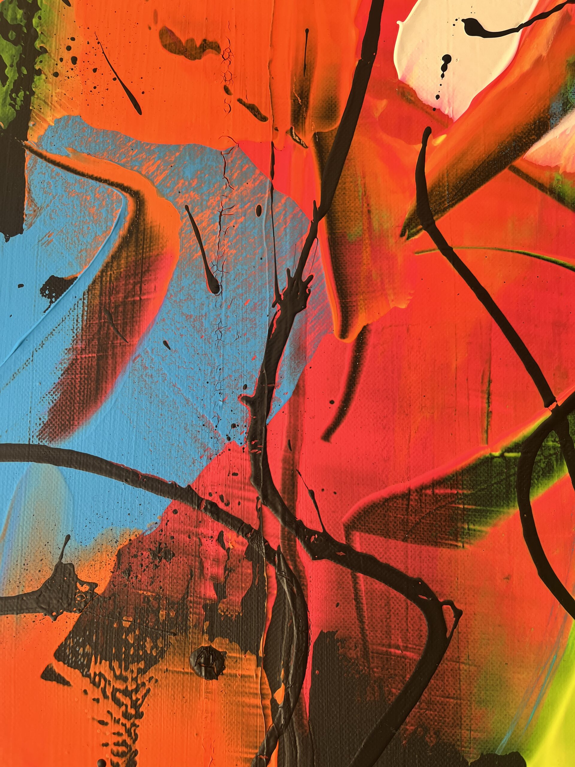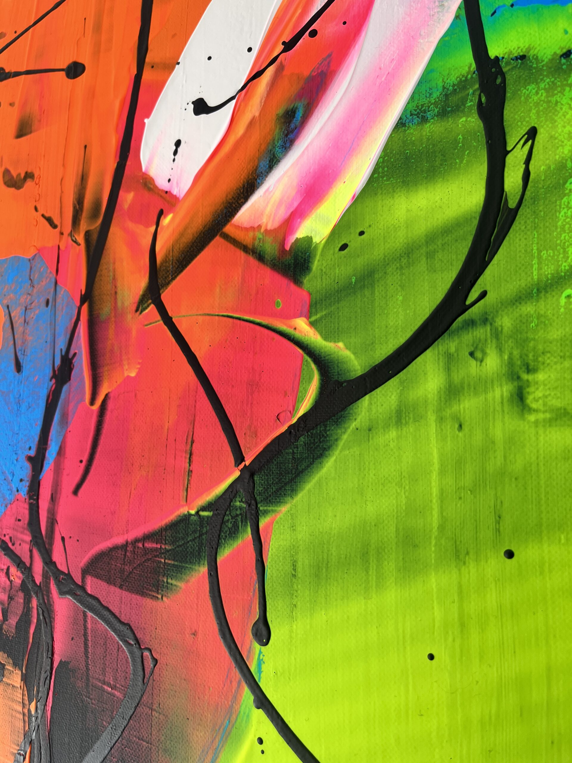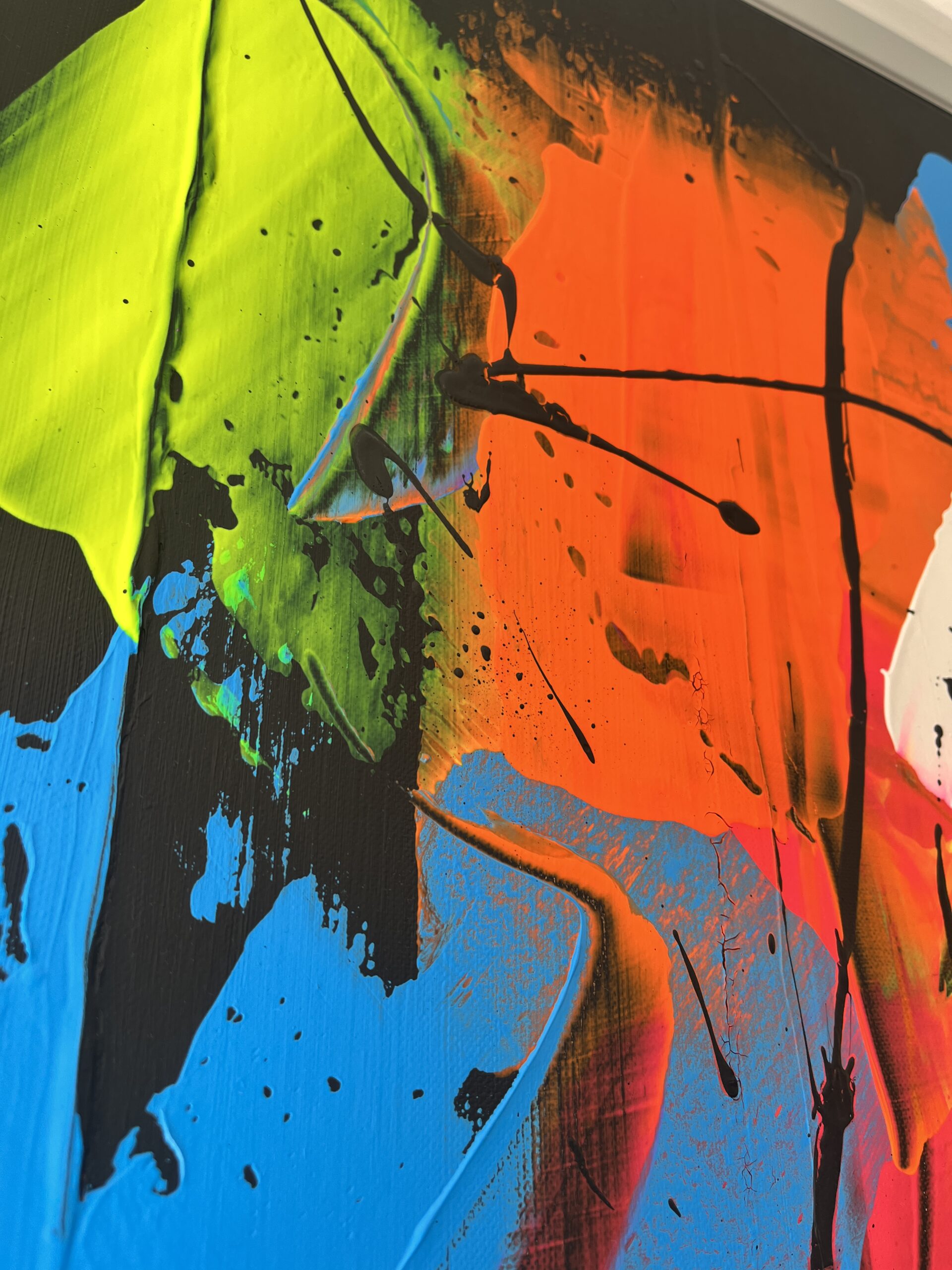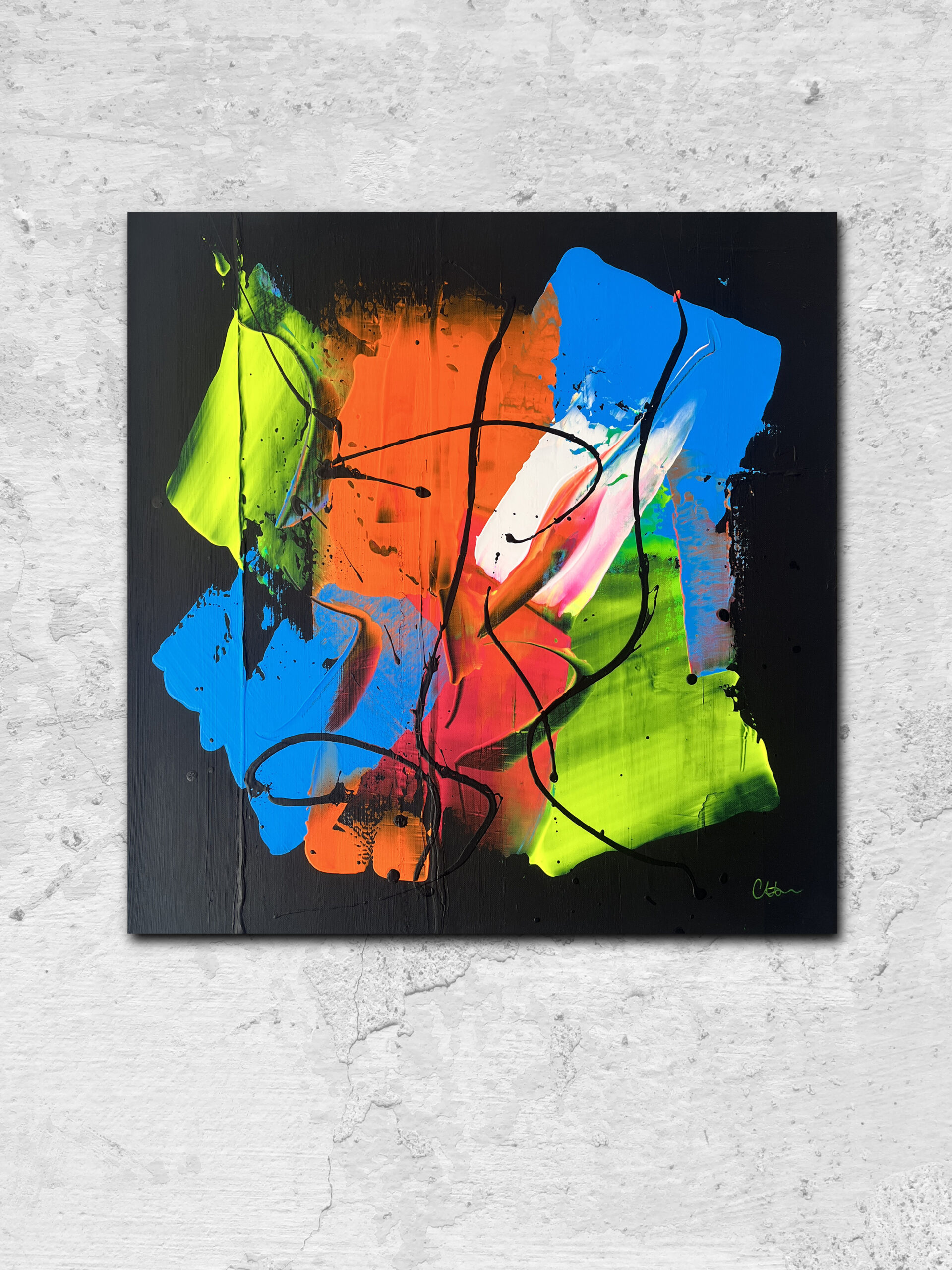 Vibrant palette knife work on a deep black backgroun, measuring 60cm x 60cm on a deep edge canvas.