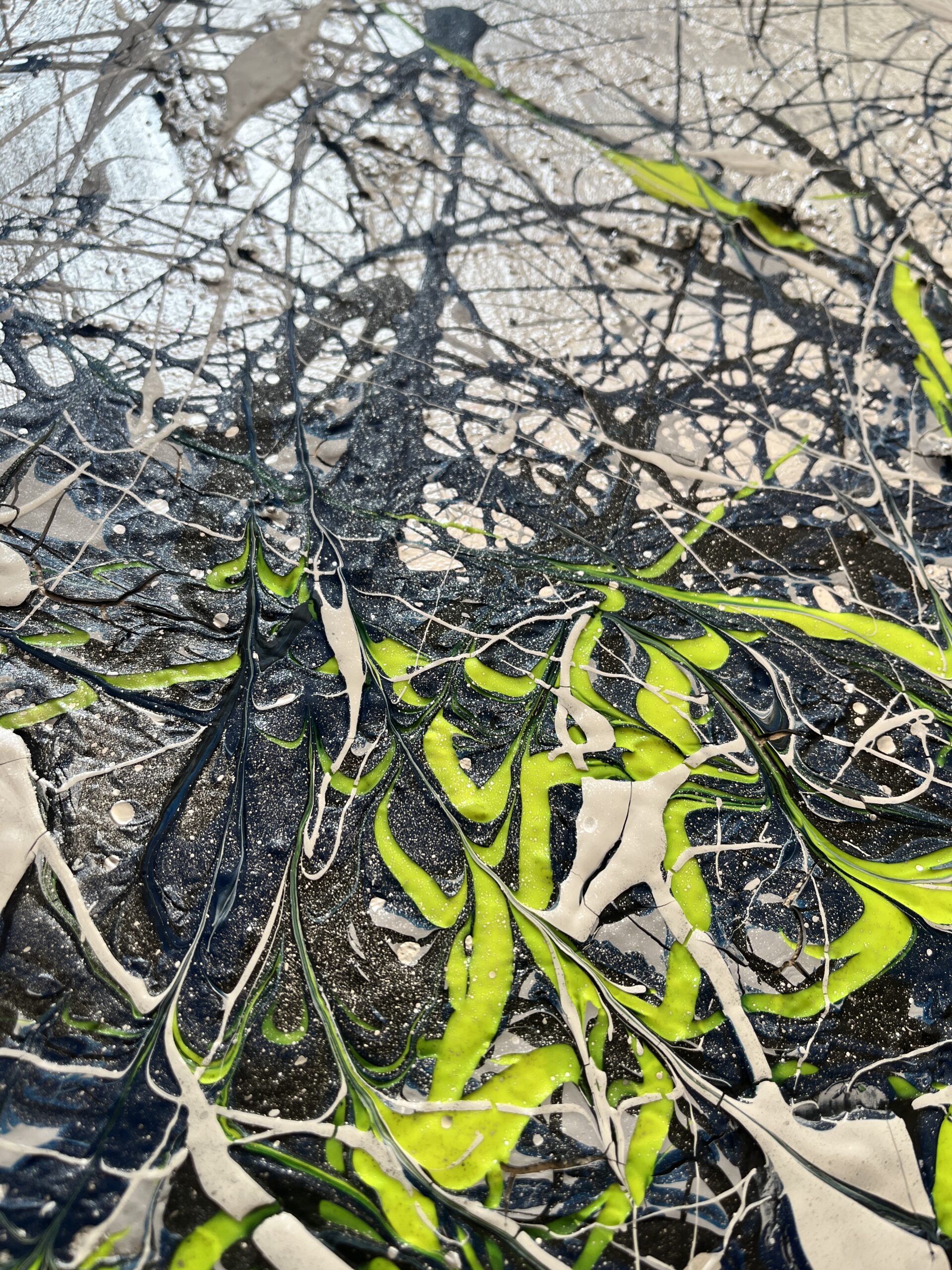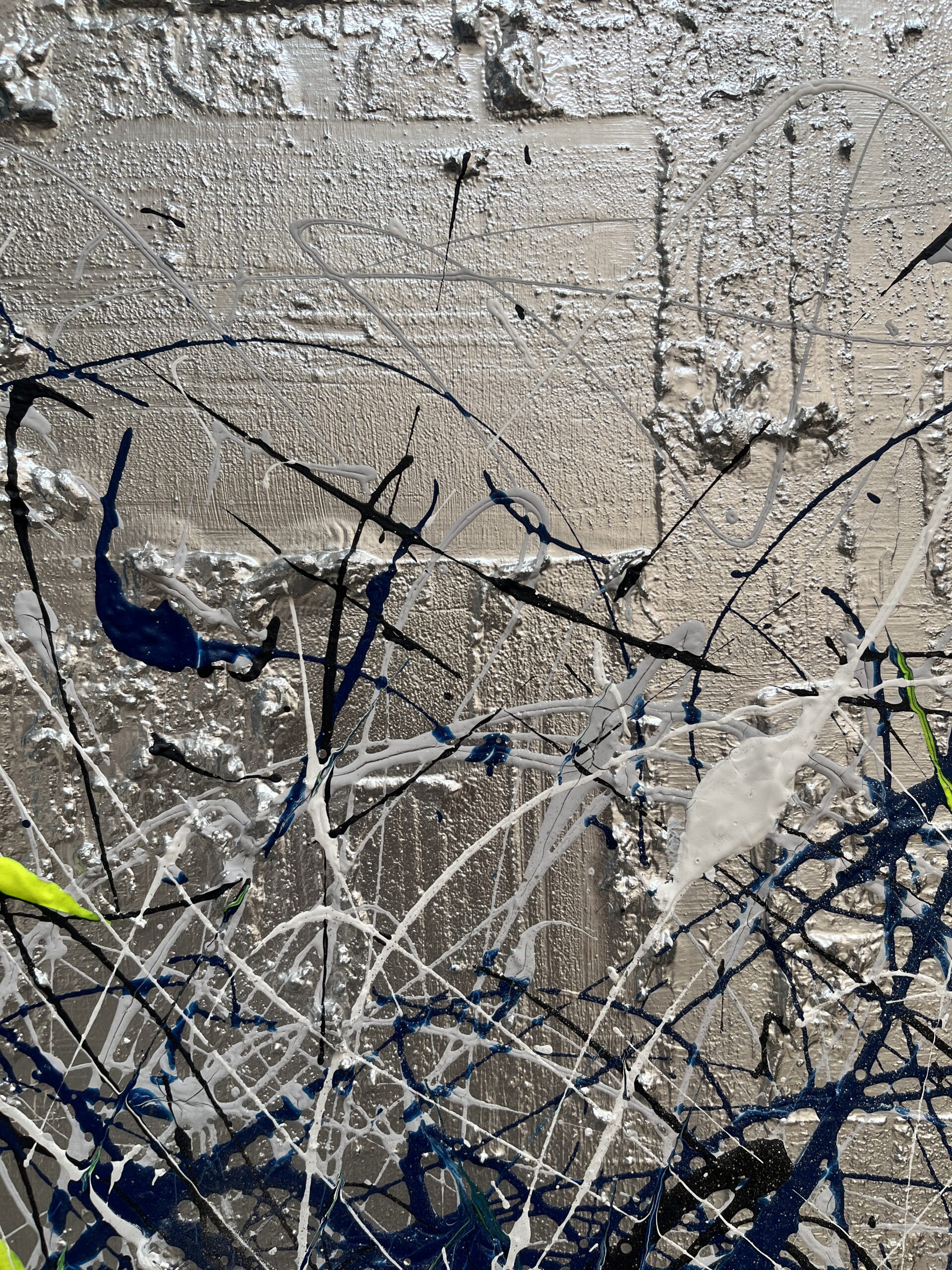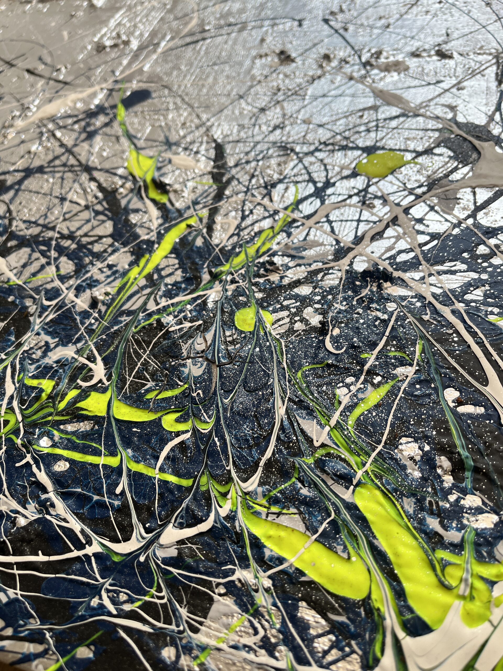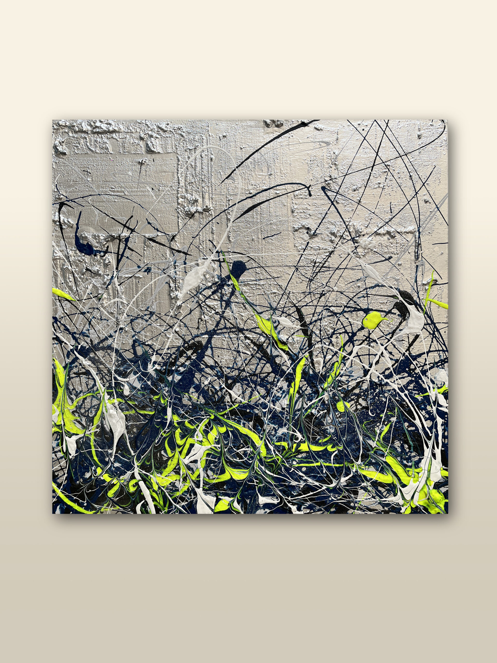 Chrome base with texture and layers of acrylics on a 50cm x 50cm deep edge canvas.