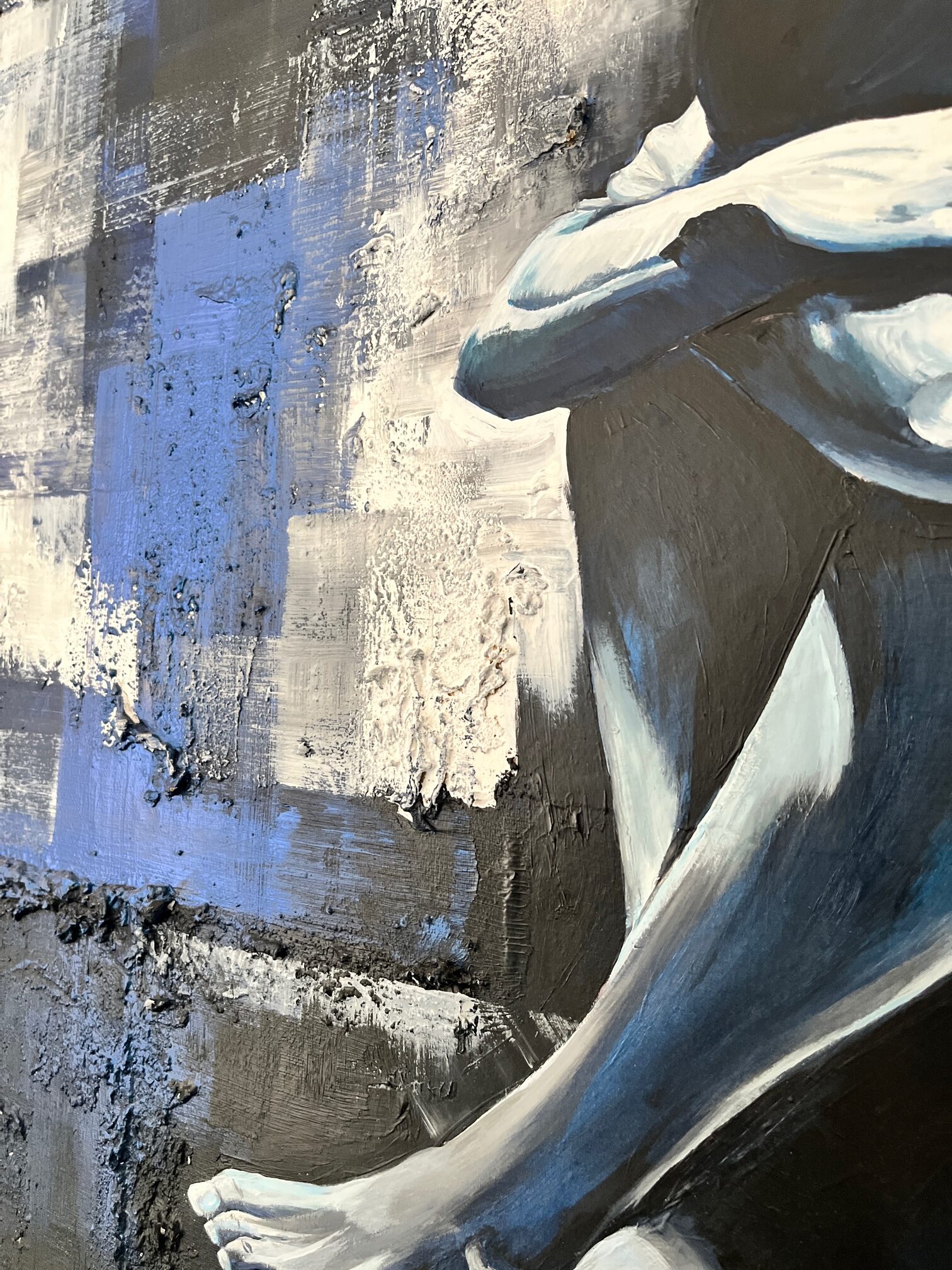 An 80cm x 60cm thin edge canvas with textured blues, whites and metallic silvers.