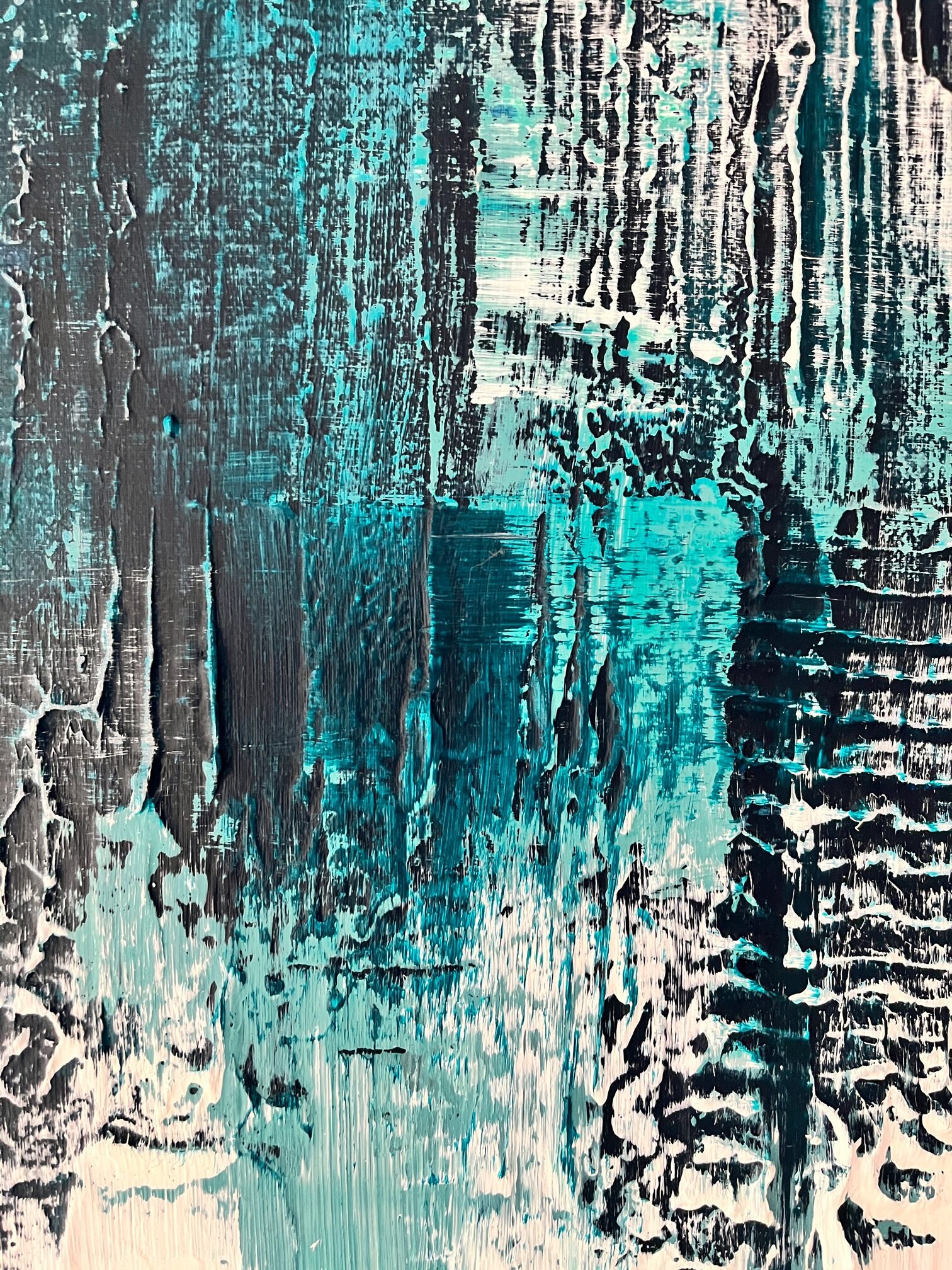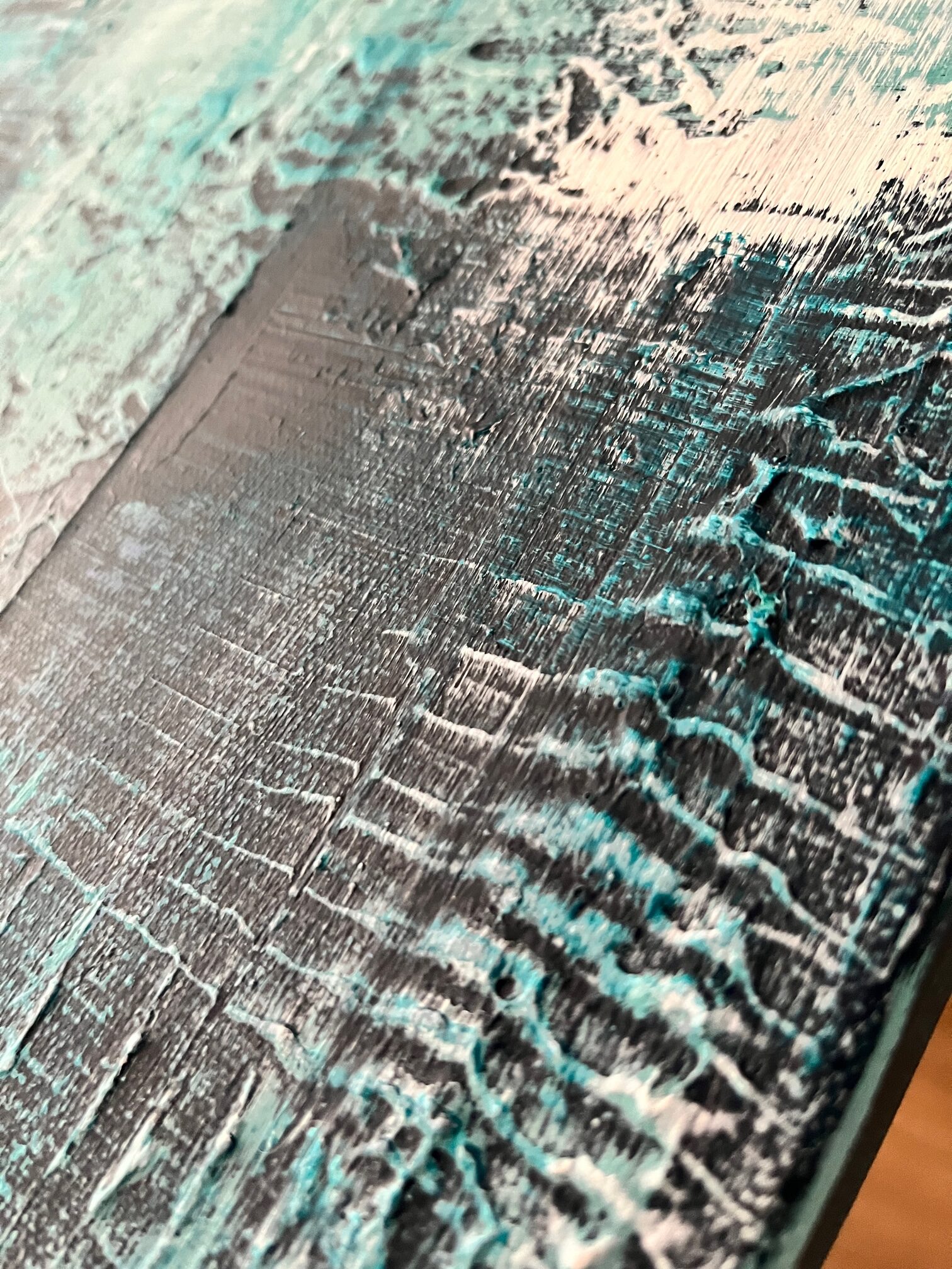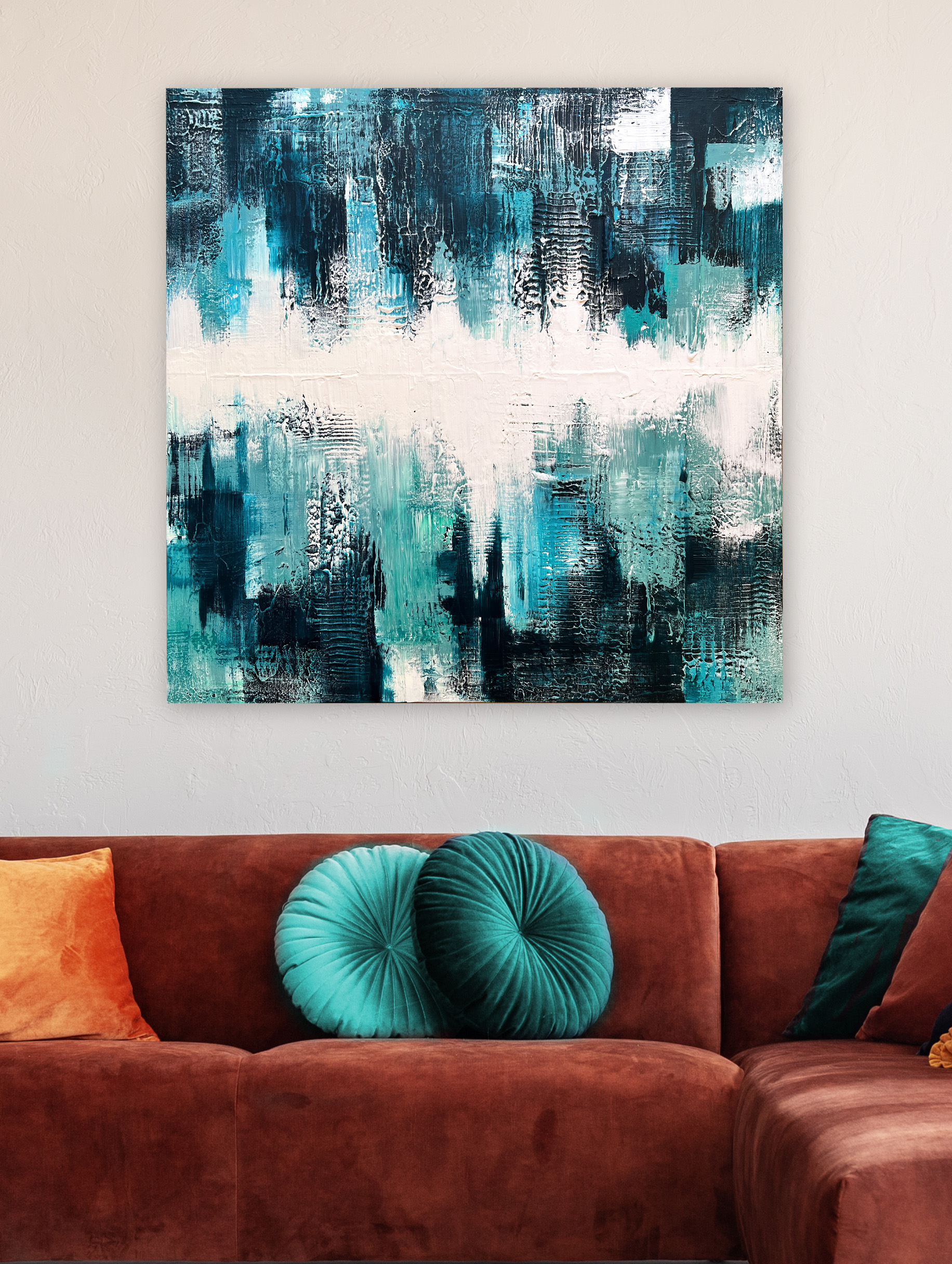An 80cm x 80cm thin edge canvas with textured created by layers of acrylic paint.